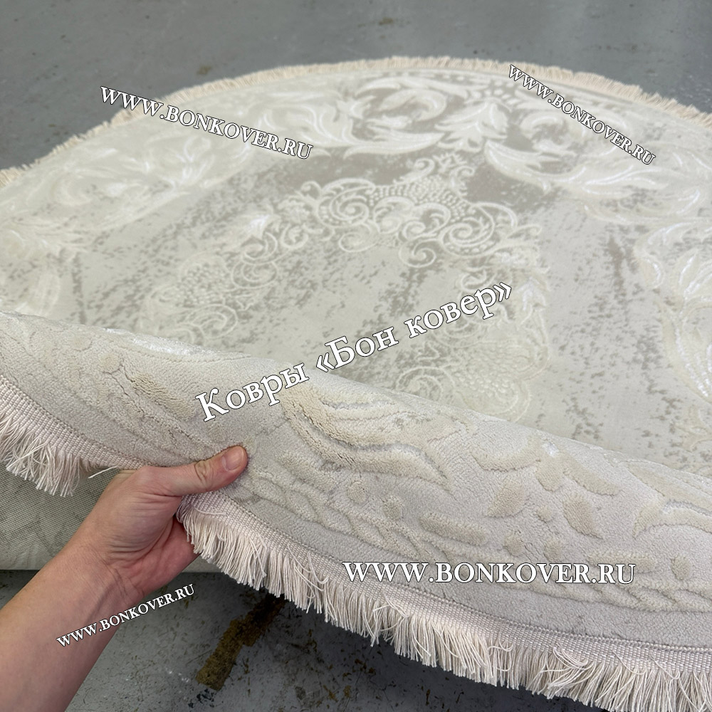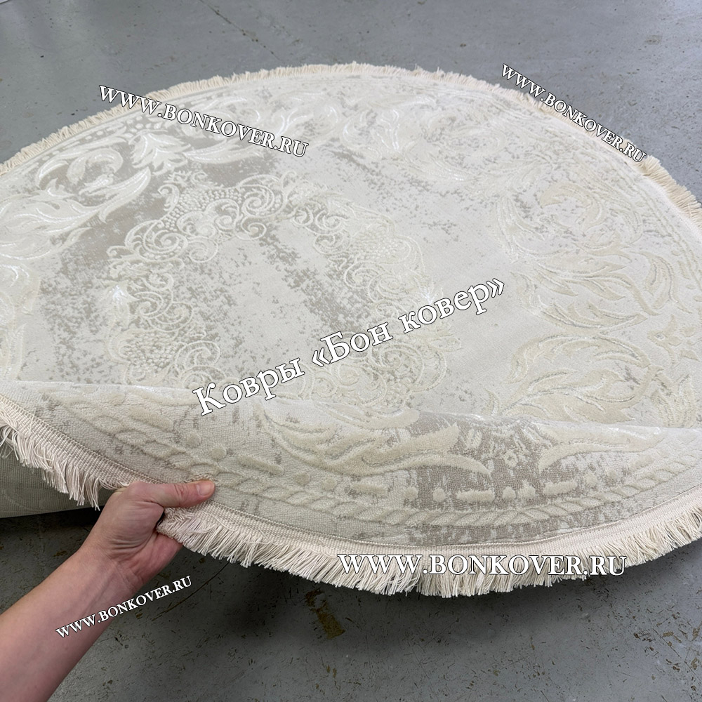 Изящный Белый Круглый Ковер Для Гостиной Медальон Дизайн 30533 наполняет интерьер гостиной теплом и уютом, гармонично сочетает в себе изящество и красоту. Он изготовлен из высококачественных материалов, комфортный и долговечный.